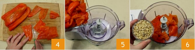 Remove the stalk and internal seeds and cut the pepper halves 4. Put the peppers in the mixer 5, also add the pine nuts 6.