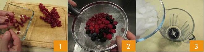 To prepare the berry milkshake, start by cleaning the fruit. First, gently separate the red currants 1, and place them in a colander along with the other berries: blackberries, blueberries, and raspberries. Then wash them well under running water 2. At this point, pour the ice into a blender 3.