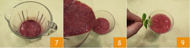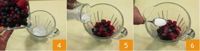 Once this is done, also add the previously washed berries 4, the cold milk 5, and the sugar 6.
