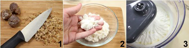Set everything aside and prepare the Chantilly cream: whip the cream with 1/4 cup of powdered vanilla sugar 3 (if desired, you can use less powdered sugar to obtain a less sweet cream since there are already candied chestnuts and meringues).