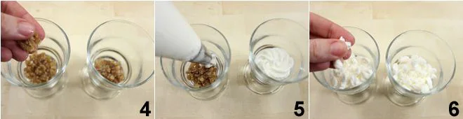 At this point, you can assemble the cups: place the Chantilly cream in a piping bag (alternatively, you can use a spoon), make a first layer with the candied chestnuts 4, then a layer of Chantilly cream 5, a layer of crumbled meringue 6, and then another of cream. Continue until the ingredients are used up.