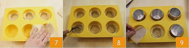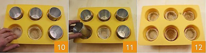 place them inside your glasses, making them adhere well to the dough 10. Finally, insert smaller molds inside, or create a weight with dried legumes so that the glasses do not puff up or create bubbles, as you do for blind baking 11. Bake in a preheated static oven at 356°F for 20 minutes (if using a fan oven, 320°F for 15 minutes). Once baked, let them cool 12 and then remove the glasses from the molds onto a rack.