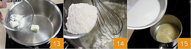 Now prepare the Parmigiano Cream: melt the butter in a saucepan 13 and, once melted, add the flour in a shower, stirring with a whisk to obtain a roux 14. Then add the milk, which you have previously warmed, in a saucepan 15 and stir well with the whisk.