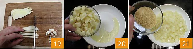 Now prepare a pear compote: peel and dice the pears 19; melt the butter in a pan, add the pears 20 and the brown sugar 21.