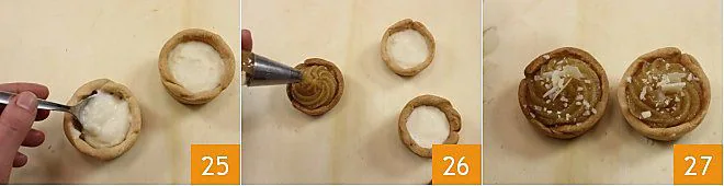Now you can assemble your beer glasses with parmesan cream: take your glasses and make a first layer with about 3 tablespoons of parmesan cream 25. Transfer the pear compote into a piping bag with a star nozzle and make the second layer over the parmesan cream, squeezing out a nice tuft 26. Lastly, garnish each glass with parmesan flakes and your beer glasses with parmesan cream are ready 27!
