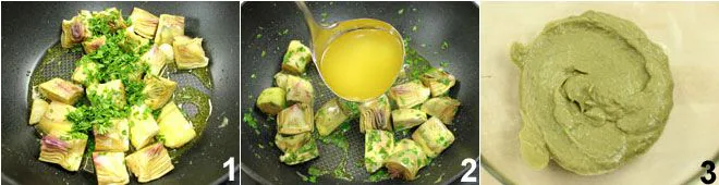 To prepare bigoli with clams on a bed of artichoke cream, start by preparing the artichoke cream: clean the artichokes by rubbing them with lemon and keep them soaked in water and lemon. In another pot, fry a clove of garlic and a tablespoon of oil. Squeeze the artichokes and place some chopped parsley and a pinch of salt in the center (if using another type of artichokes, cut them into quarters removing the central choke and the tougher outer leaves 1. Put them in the pot with a ladle of vegetable broth 2, cover them and cook until tender. Then blend them to obtain a sufficiently thick cream 3.