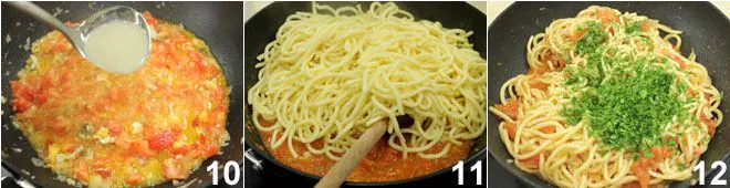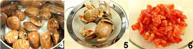 Open the clams 4 in a covered pot and filter their water 5. Then remove them from the shells. Wash the tomatoes and cut them into pieces 6.