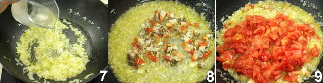 In a pan, brown the white onion from Chioggia in a tablespoon of extra virgin olive oil, deglazing with a little white wine 7. Then add the chopped clams 8 and Cavallino tomatoes 9.