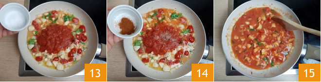 and the basil leaves 10. Quickly sauté everything, then remove the garlic 11 before adding the tomato puree 12,