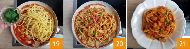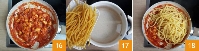 While the sauce is cooking 16, drop the bigoli into a pot with plenty of boiling salted water 17. Cook according to the package instructions and drain directly into the sauce when ready 18.