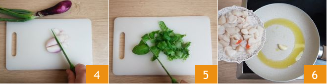 Clean and thinly slice the spring onions 4 and finally roughly chop the basil 5. Move to the stove and heat some oil in a pan along with a clove of garlic. Then add the scallops and let them sizzle for a moment 6.