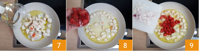 Deglaze with white wine 7, let the alcohol evaporate, and add the chopped cherry tomatoes 8, the sliced shallot 9,