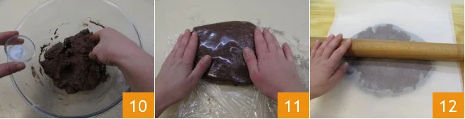 Add the baking powder 10 and work the ingredients with your hands, which should be very cold, trying to perform the operation quickly so as not to heat the mixture too much. Continue kneading until you get a homogeneous and lump-free dough: then cover it with transparent plastic wrap 11 and let it rest in the refrigerator for about 30 minutes. After this time, remove the mixture from the fridge, remove the plastic wrap, and place it between two sheets of parchment paper. This precaution prevents the use of additional flour to roll out the dough. Flatten the dough with a rolling pin to a thickness of about 0.4 inches 12.