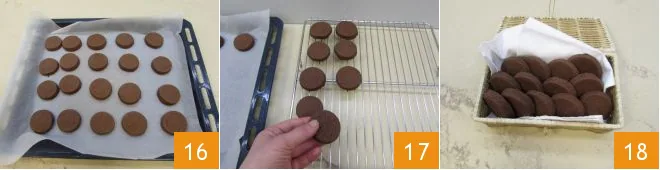 Once you have the desired thickness, take a cookie cutter with a diameter of 1.5-2 inches and start cutting the dough 13. Transfer the cookies thus obtained onto a baking tray lined with parchment paper. To move them, you can use a spatula 14 to avoid leaving fingerprints on the sides or surface of the cookies. Bake your chocolate cookies in a preheated static oven at 356°F for 13 minutes (if using a convection oven, you can bake them at 320°F for 5-6 minutes) 15. You can test the time and temperature for your oven by baking a first batch with a few pieces.