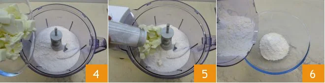 Add the cold butter from the fridge cut into chunks 4 and season with salt 5. Pulse the mixer to obtain a crumbly mixture that you will then transfer into a large bowl 6.