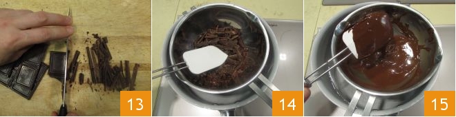 Meanwhile, chop the dark chocolate with a knife 13 and melt it in the microwave or in a double boiler (14-15).