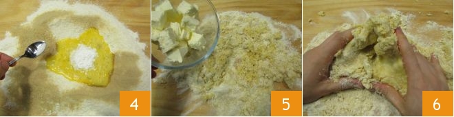 and the salt 4. Start gathering the ingredients with your hands, then add the cold butter cubes 5. Knead quickly to avoid overheating the dough 6,