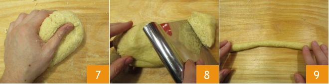 until you obtain a soft and homogeneous dough ball 7. Now preheat the oven to 375°F (static mode). Take portions of dough with a dough scraper 8, roll them out to create long logs about ¾ inch in diameter 9,