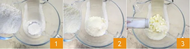 To prepare the biscuits with Parmesan and Pecorino, start by pouring the flour into the bowl of a stand mixer fitted with a flat beater 1. Add both types of cheese 2, cold cubed butter, pepper, and salt 3.