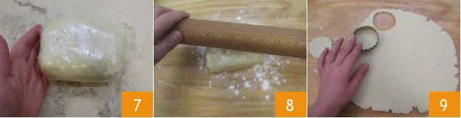 Wrap it with plastic wrap, and let it rest in the fridge for 30 minutes 7. After this time, retrieve the block and roll it out with a rolling pin 8 on a lightly floured surface, to a thickness of 1/8 inch. Using a cookie cutter of your desired shape, form your biscuits now 9; with these quantities and 2.5-inch diameter cutters, you will get about 14!