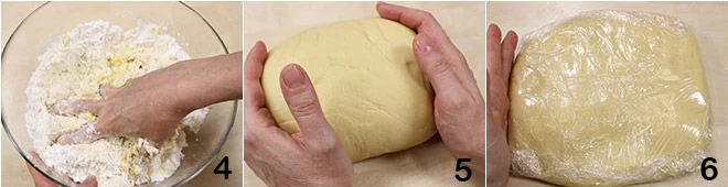 In the bowl, start mixing all the ingredients with your hands, then continue to work the dough on a pastry board 4: you should obtain a compact and elastic dough. As soon as the shortcrust pastry is ready, form a ball 5, cover it well with plastic wrap and put it in the refrigerator to rest for about half an hour 6.