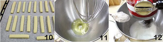 Repeat the operation with the dough you had stored in the refrigerator. Place the obtained sticks on a baking sheet covered with parchment paper and bake them for 15-16 minutes at 356°F in a static oven 10. While the shortcrust pastry is baking, prepare the royal icing: using a stand mixer, whip an egg white until stiff 11, then add the powdered sugar, one tablespoon at a time, and a few drops of lemon juice, continuing to beat until everything is completely mixed 12. Do not overdo the amount of lemon juice added, otherwise the royal icing will have difficulty setting.