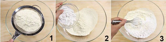 To prepare the Krumiri-type cookies, preheat the oven to 392°F, sift the all-purpose flour into a large bowl 1, then add the powdered sugar 2, the pulp from the vanilla pod, and a pinch of salt: mix all the ingredients well using a whisk 3.