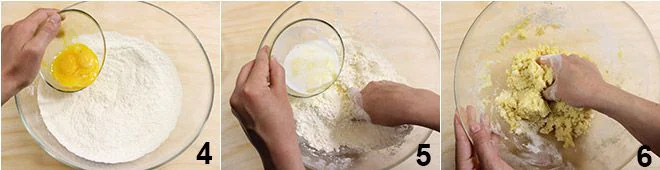 Now separate the egg whites from the yolks and melt the butter in a saucepan over low heat. Add the yolks 4 and the melted butter 5 to the mixture, then start kneading with your hands until you get a smooth and compact dough 6.