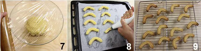 Form a ball, cover it with plastic wrap 7, and let it rest for half an hour at room temperature. After the necessary time, fill a canvas pastry bag (or a plastic syringe) with a star-shaped nozzle with the obtained dough, putting a little dough at a time and always softening it with your hands. On a baking sheet lined with parchment paper, form crescent-shaped cookies, about 3 inches (7-8 cm) long 8. Bake everything at 392°F for 16 minutes, or until the cookies are golden; once the Krumiri-type cookies are ready, let them cool on a wire rack 9.