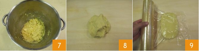 Work until you get a homogeneous mixture 7. At this point, transfer it to a work surface, shape it into a disk 8 and wrap it in plastic wrap 9. Let it rest in the refrigerator for at least 1 hour.