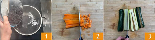 To prepare Black Venus rice with vegetables, first cook the rice in salted boiling water for the time indicated on the package 1. Meanwhile, peel the carrots and cut them into cubes about 1/2 inch 2. Trim and cut the zucchini first into sticks 3 and then into cubes of the same size.
