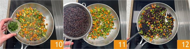 At the end of cooking, add the chopped parsley for aroma 10. Drain the rice and transfer it to the pan 11, then stir to combine the ingredients 12 and plate.