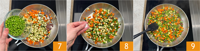 Add the peas 7, salt 8, stir and cook over medium-high heat, stirring often, for 10 minutes 9.
