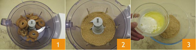 To prepare the blackberry cheesecake start with the crust. Melt the butter and set it aside to cool. In a food processor, add the whole-wheat cookies 1 and blend until you obtain a fine powder 2, then transfer the mixture to a bowl. Pour the butter 3.
