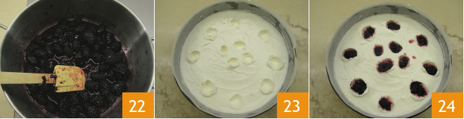 Stir and let simmer over low heat for about 10 minutes 22. The blackberries should not fall apart but remain whole. Now, using a teaspoon, make 12 holes in the filling 23 and place one blackberry in each hole 34.