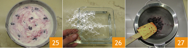 Then level the cheesecake with a spatula 25 and transfer it to the refrigerator for at least 4 hours. After 4 hours soak about 2 tsp (≈6 g) of gelatin in cold water 26. Take a few tablespoons of the heated blackberry juice and pour it into a small saucepan through a fine sieve 27.