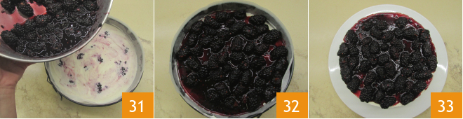 Pour the resulting mixture over the cheesecake 31, spreading it evenly 32 and transfer to the refrigerator for another 2 hours. After the chilling time your blackberry cheesecake is ready to be served 33.