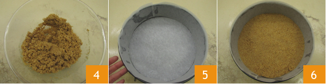 Mix thoroughly to combine 4. Grease a 9-inch springform pan and line the bottom and sides with parchment paper 5. Pour the cookie mixture and press it with the back of a spoon to distribute it evenly across the bottom of the pan 6. Transfer the crust to the freezer for 15 minutes (or about half an hour in the refrigerator).