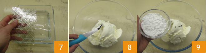 Meanwhile prepare the filling. Soak about 3 tsp (≈9 g) of gelatin in cold water for about 10 minutes 7. Pour the ricotta and the cream cheese into a large bowl 8, flavor with the vanilla seeds and the powdered sugar 9.