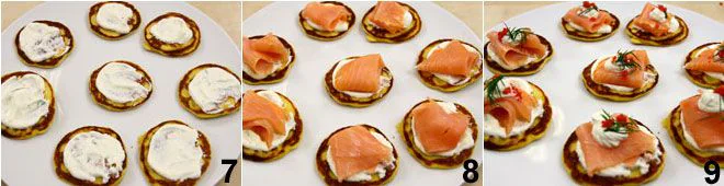 Spread the sour cream on the blinis 7, place a strip of smoked salmon on top 8, and garnish with another dollop of sour cream, some dill, and a bit of red lumpfish roe 9. The blinis are ready to be enjoyed as a great appetizer!