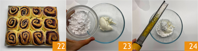Remove the swirls from the oven and let them cool down 22. Meanwhile, prepare the frosting: in a bowl, pour the cheese, sugar 23, and lemon zest 34.