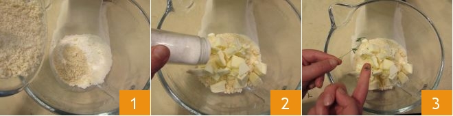 To prepare the boats with Parmesan cream and grapes, start by preparing the savory pastry base, by pouring the flour into the bowl of a stand mixer fitted with a paddle attachment. Also add the Parmesan 1, the cold butter from the fridge cut into cubes, pepper, and salt 2, and the thyme leaves 3.
