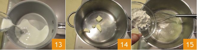 While the boats are baking, prepare the Parmesan cream. Pour the milk into a high-sided pan 13 and heat it without bringing it to a boil. Then, in another saucepan, melt the butter over low heat 14. Once melted, add the flour in a sprinkle 15.