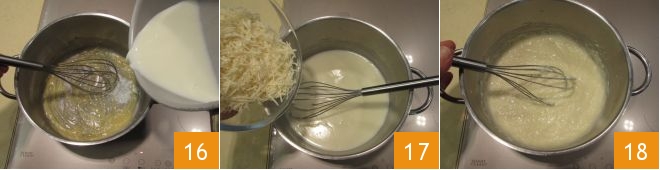 Stir with a whisk to obtain a well-blended and golden roux. Gradually add the previously heated milk to the roux 16, always stirring with the whisk. Continue stirring and cook the mixture over low heat. When the mixture has thickened, remove the saucepan from the heat and gradually add the grated Parmesan cheese 17, mixing it into the mixture with the handheld whisk. You need to achieve a fairly thick consistency 18.