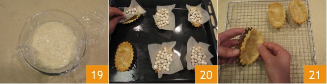 Transfer the cream to a bowl, cover it with plastic wrap 19, and let it cool. Meanwhile, the boats will be cooked; remove them from the oven, take out the parchment paper with the balls, and let them cool slightly before removing the paper with the balls 20. Then, carefully unmold them, if possible on a wire rack 21