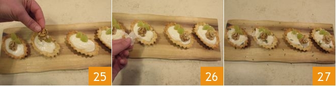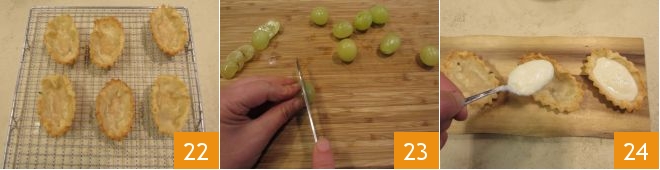 so they can cool completely 22; you can then start filling them: wash the grape berries and cut them into thirds lengthwise 23. Fill the boats with a tablespoon of Parmesan cream 34