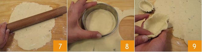 After this time, retrieve the loaf and roll it out with a rolling pin on a lightly floured surface to a thickness of about 1/8 inch 7. Using a 4.5-inch cookie cutter, cut out 6 discs 8. Grease 6 boat-shaped molds about 4 inches long and about 1 inch high with a fluted edge; place the dough disc inside, adhering it well to the bottom and edges 9.