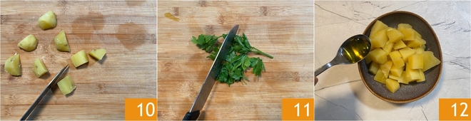 Once cooled, cut the potatoes into 1-inch chunks 10. Now move on to seasoning: finely chop the fresh parsley 11 and season in a bowl with extra virgin olive oil 12.