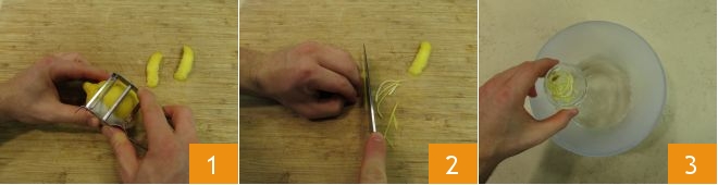 To prepare the limoncello Bombardino, start with the lemon. After washing and drying it well, use a peeler to obtain two zests 1 and from these create strips as thin as possible 2. Immerse them in a chilled bowl containing ice water and leave them there 3.
