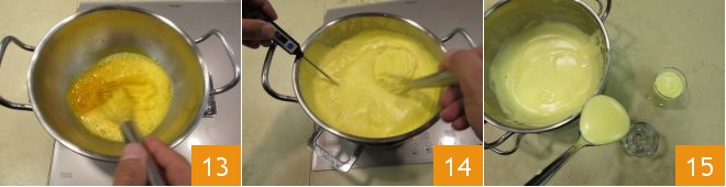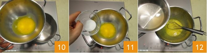 Meanwhile, place a mixing bowl over a pot of water, ensuring the bottom of the bowl doesn't touch the liquid 10. Turn the burner to medium heat and add the egg yolks and the remaining sugar 11, pour in a splash of the syrup and start whisking 12.
